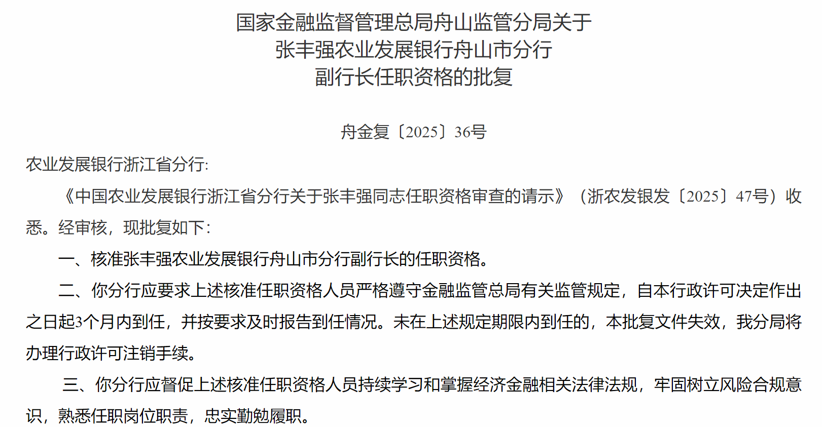 8月7日,国家金融监督管理总局舟山监管分局发布关于张丰强农业发展银行舟山市分行副行长任职资格的批复,核准张丰强农业发展银行舟山市分行副行长的任职资格。